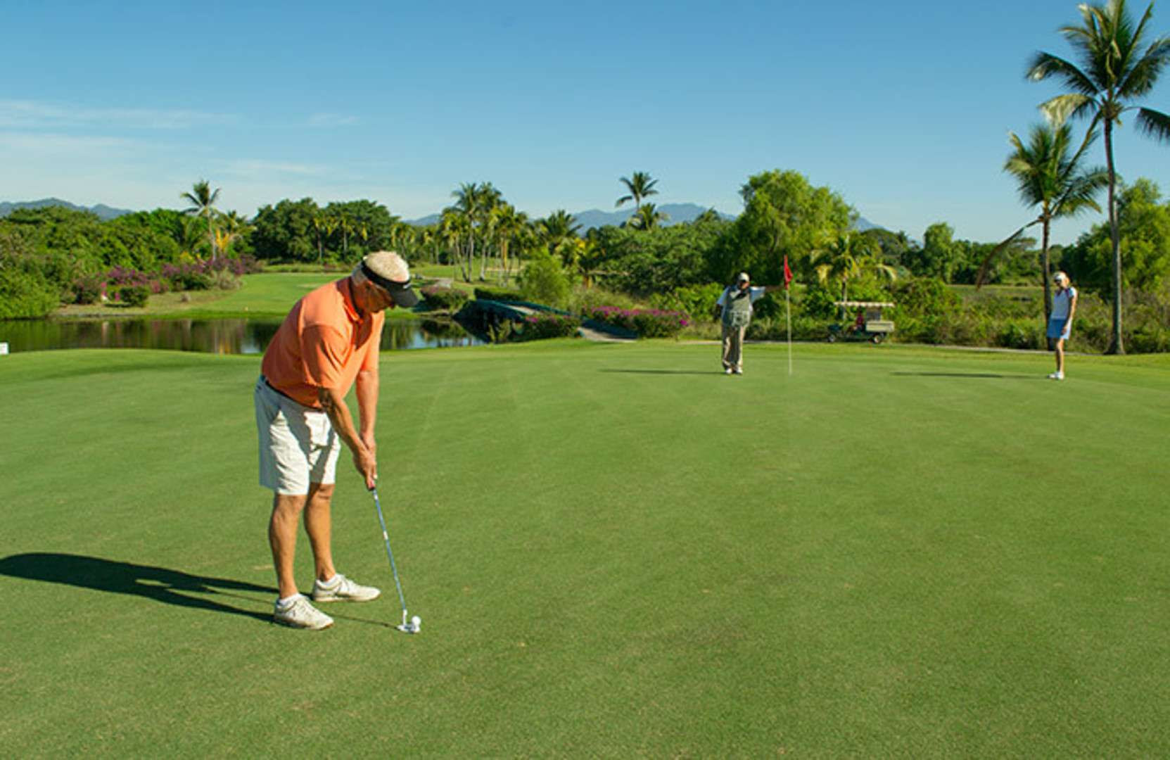 Flamingos Golf es un campo par 72 de 6853 yardas de largo con fairways ligeramente angostos dispuestos sobre un terreno con suaves colinas EI campo tiene pasto Bermuda tanto en los fairways como en los greens y posee 9 obstaculos de agua y 43 trampas de arena la mayoria de los cuales protegen las aproximaciones a sus greens Iigeramente rapidos