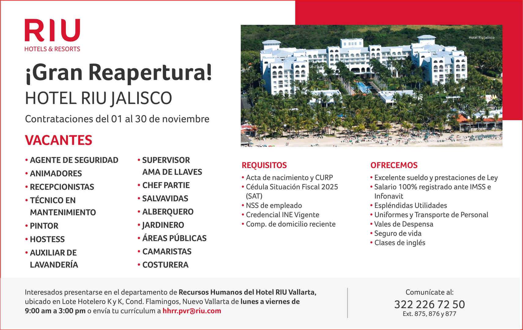 Interesados presentarse en el departamento de Recursos Humanos del Hotel RIU Vallarta,