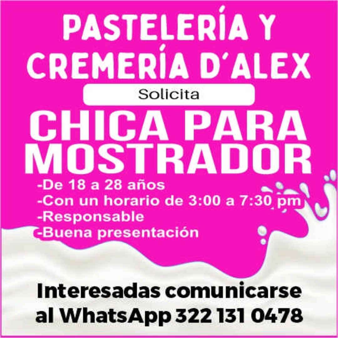 PASTELERíA Y CREMERíA D'ALEX Solicita CHICA PARA MOSTRADOR , -De 18 a 28 años -Con un horario de 3:00 a 7:30 pm -Responsable -Buena presentación Interesadas comunicarse al WhatsApp 322131 0478