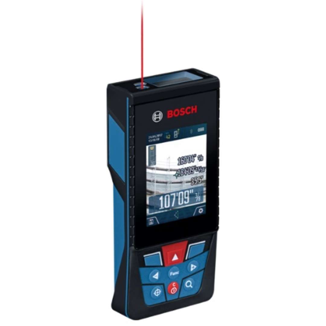 The Bosch BLAZE Outdoor GLM400CL Connected Laser Measure with Digital Viewfinder features an adjustable zoom to find the laser spot in sunlit conditions up to 400 feet away from the spot.