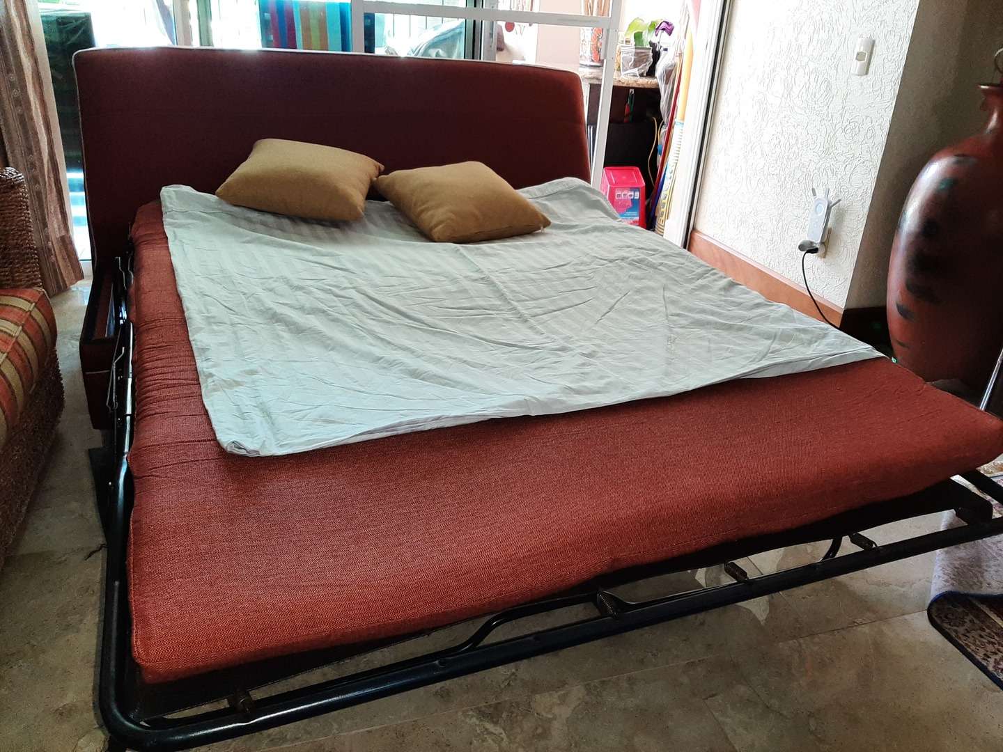 1-Sofa cama, tamaño matrimonial, casco madera, abatible con mecanismo de cama oculta, colchon de hule espuma, acabado respaldo y sofa tapizado, con 2 cojines, 1.70 cm ancho. Precio $ 8,000.00 (lo compré en $ 14,000.00).