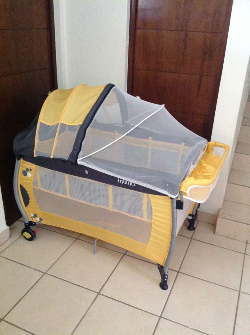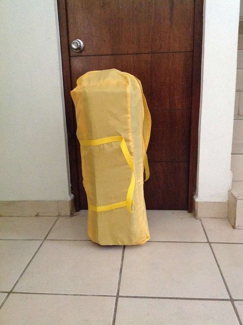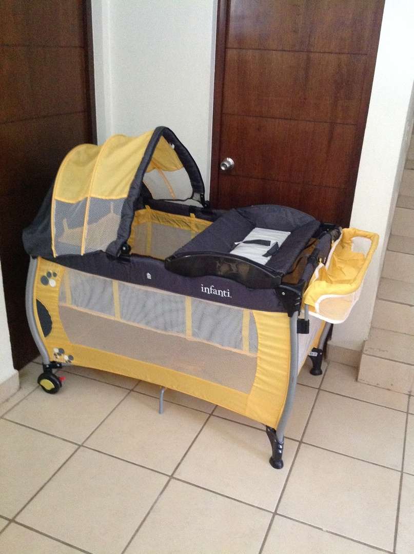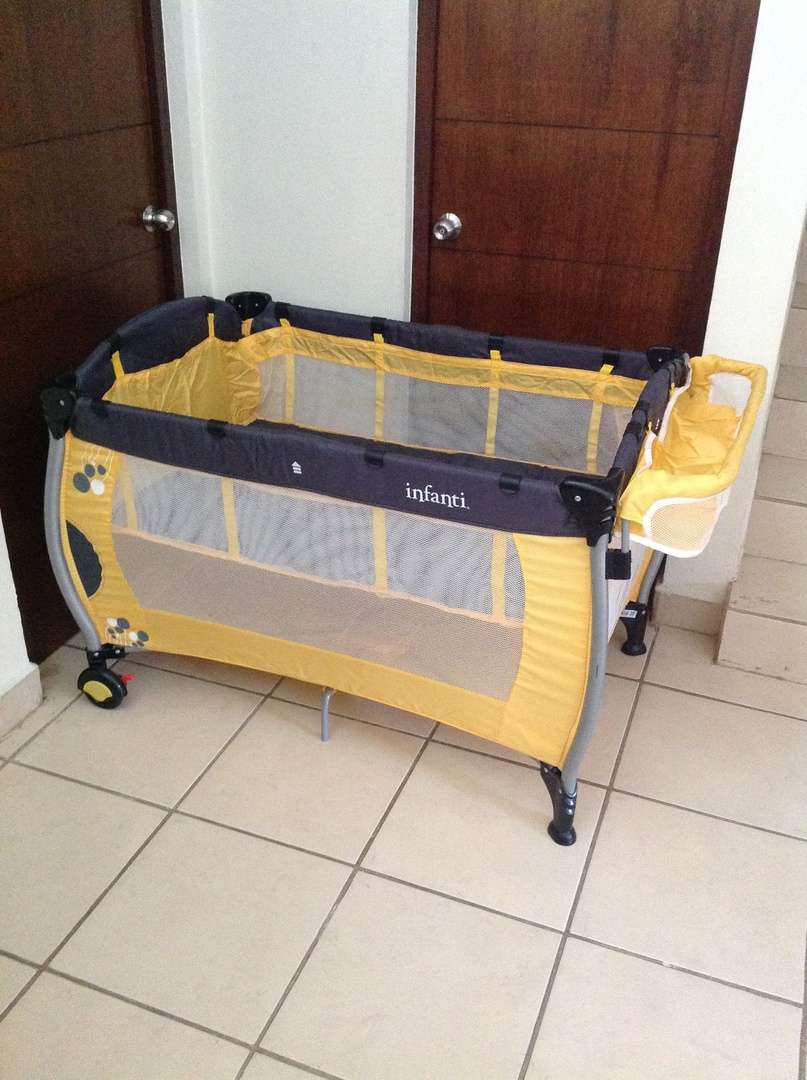 cuna de viaje marca Infanti color amarillo con negro