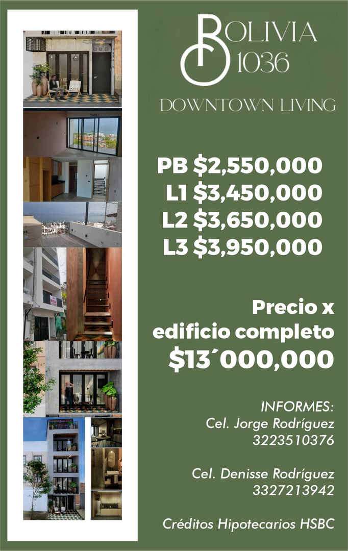 OLIVIA 1036 DOWNTO\VN LIVING 1-3 Precio x edificio completo $13Dooo,ooo INFORMES: Cel. Jorge Rodríguez 3223570376 Cel. Denisse Rodríguez 3327273942 Créditos Hipotecarios HSBC